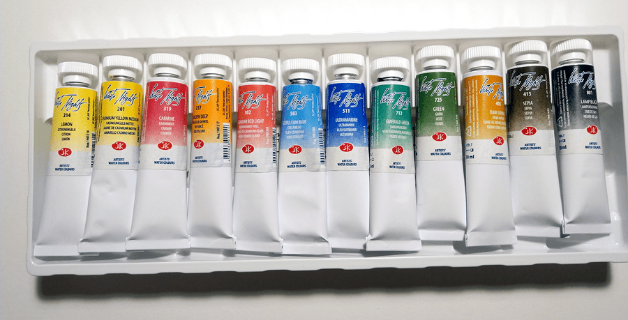 The ready made 12pcs set had good collection of basic colors with cool and warm options: Lemon (T ***), Cadmium Yellow Medium (O ***), Carmine (T **), Golden Deep (T ***), Cadmium Red Light (O ***), Ceruleum Blue (ST ***), Ultramarine (ST ***), Emerald Green (T ***), Green (T **), Raw Sienna (ST ***), Sepia (ST ***) and Lamp Black (ST ***)