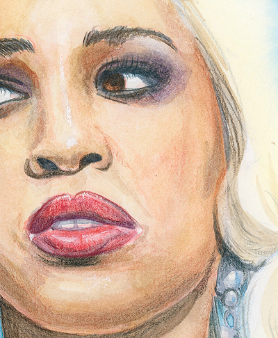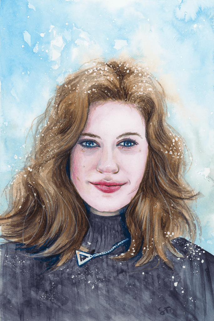 I used (before starting to paint) masking fluid to protect the necklace and made the snow on the hair and clothes by sprinkling drops of the fluid all over. I also used Sakura Gelly Roll for a few white highlights in the end.