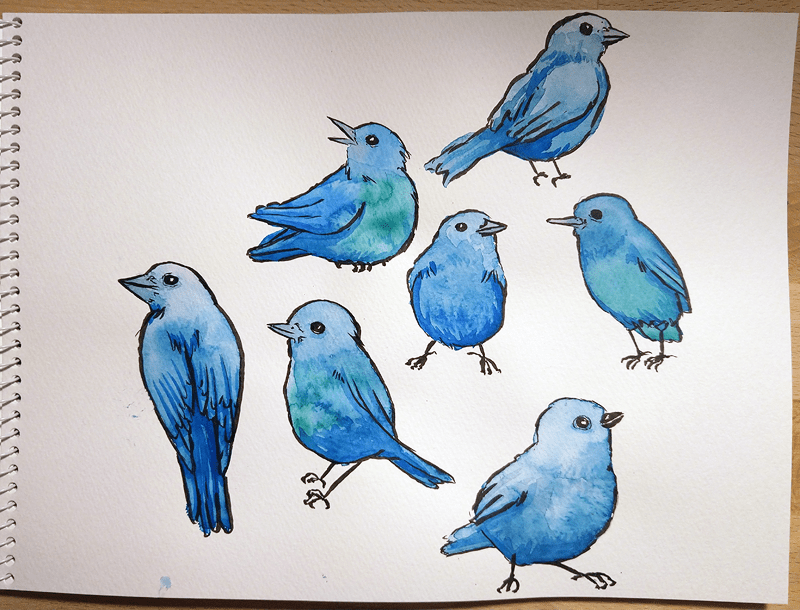 And last, the little birds were just recent random watercolor doodling using different blue/green shades and lines were made with black Pigma brush pen. (I did line art first and then colored)