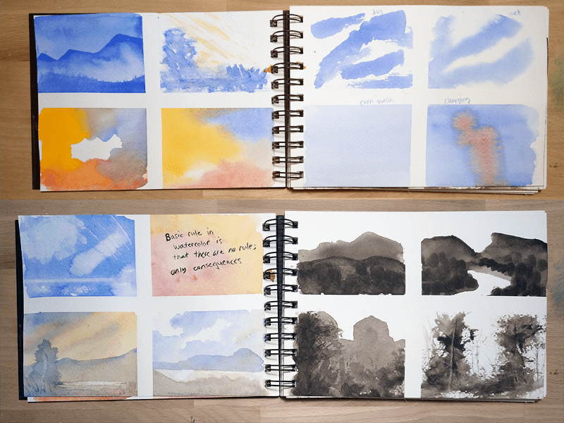 First was just testing the Daniel Smith color tubes I got and the next four pages of studies were based on the book: Tate Watercolour Manual: Lessons from the Great Masters (still have not finished reading, have some studies to continue before I read further..). The quote was also from the book, nice reminder that there is no right or wrong, just go with the flow and work with what you got.