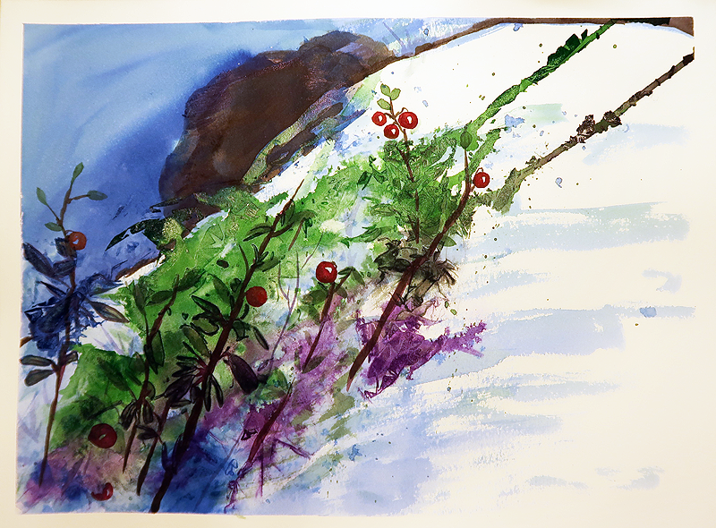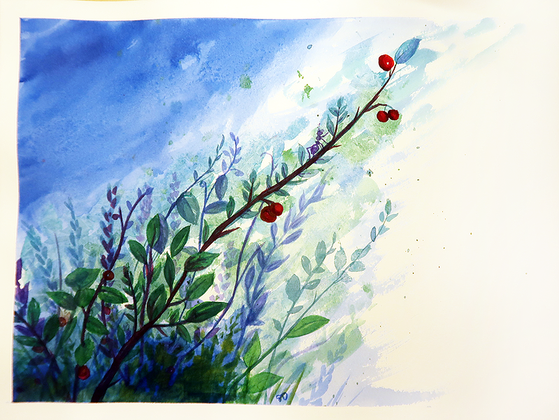 I was inspired by a little stroll in the forest. Bright blue sky, white ground and slight green patches here and there amidst the snow with rare occasion of some berries. I wanted to keep things quite loose and also to use inks for a change, so these are fully ink paintings. (Rohrer & Klingner)
