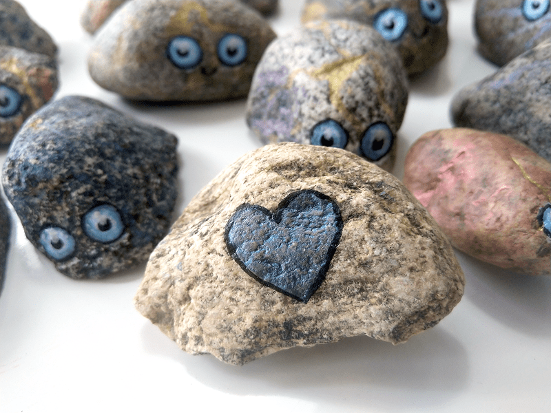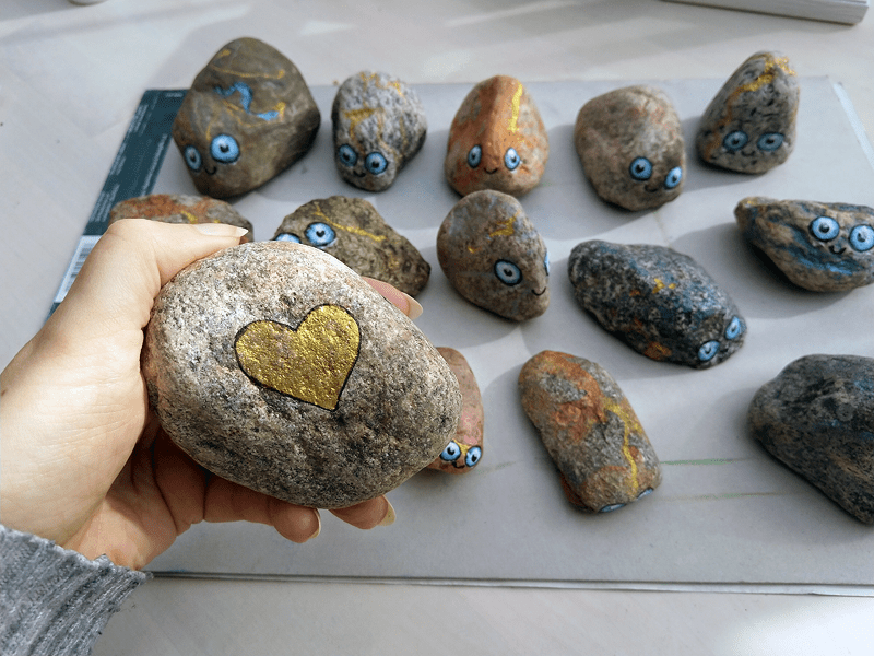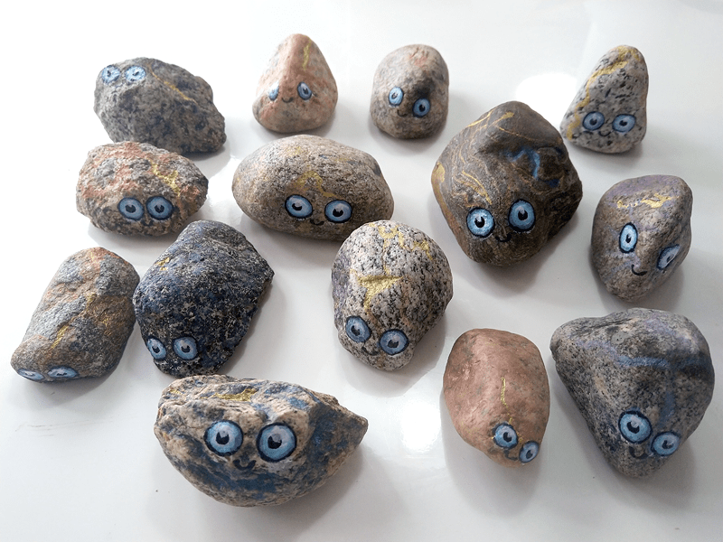 And then I made the eyes using acrylic paints and black Pigma Brush pen. In the end varnished the entire stone surface (matt stone, gloss eyes). All of the stones also have a little heart in the bottom ❤