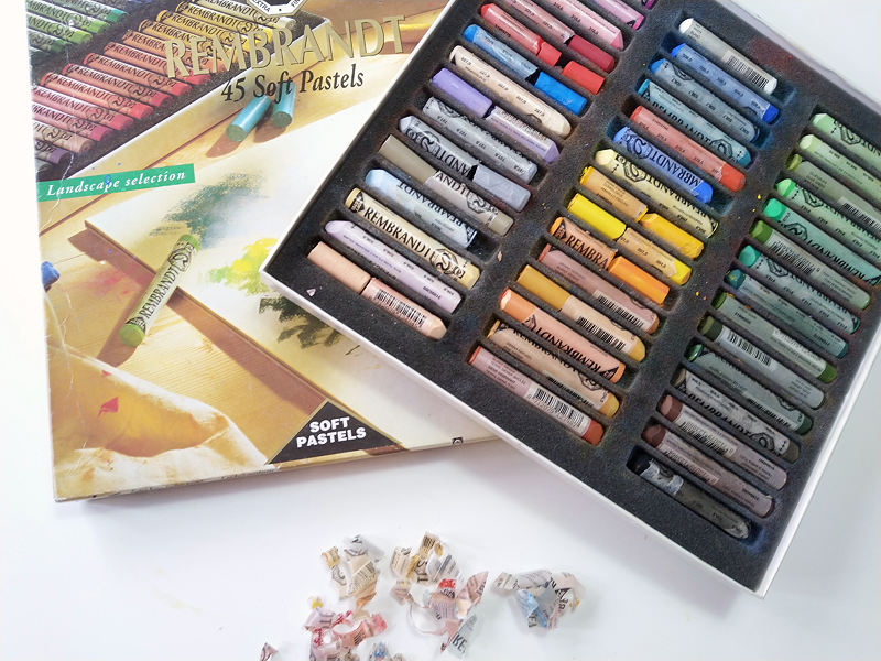 The soft pastel set is a 45pcs ‘Landscape’ set by Rembrandt. Now I split some of the pastels I used and peeled the papers off from the other half. (I had not dared to mutilate them before)