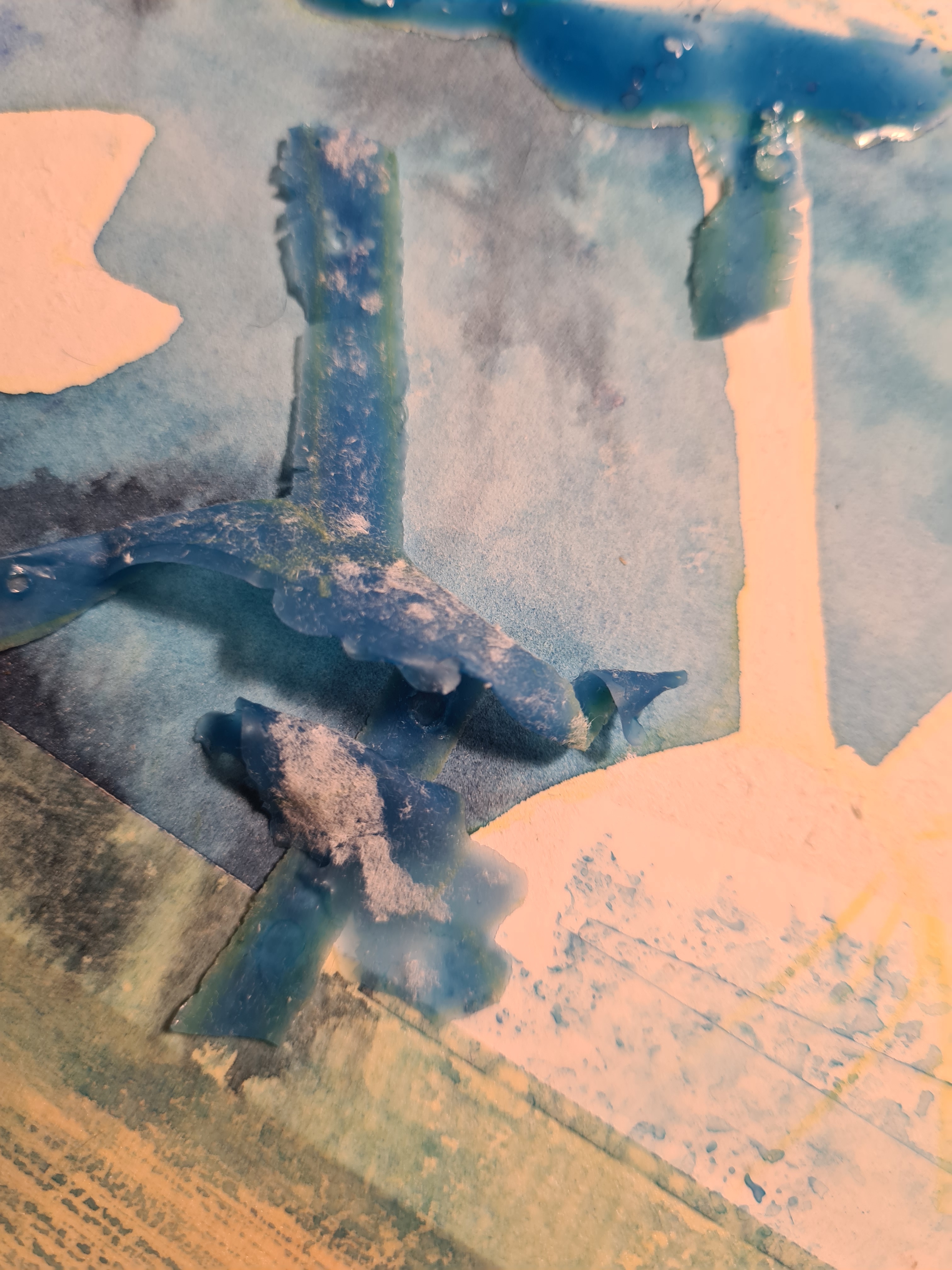 I have not used acrylics in ages, so the color drying on the plate was a bit annoying as it was unusable after that (not like with watercolor and gouache I can just rewet the paint). I was also intrigued to see how well colorpencils could be used over the acrylics and at least with the diluted acrylics it was ok.