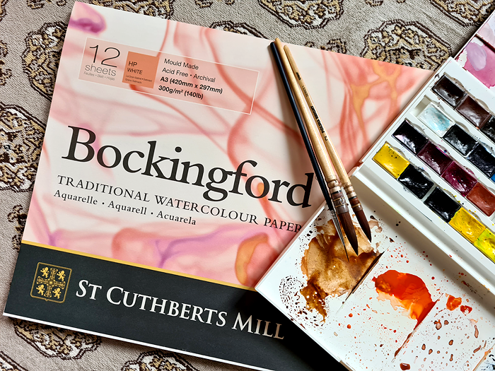 So, as I mentioned earlier running out of watercolor paper, I also got new watercolor papers to use. I bought few different brands, all hot press but still a bit different. I now first used this St Cuthberts Mill Bockingford aquarelle paper, hot press (satin) 300GSM A3. It was a bit grainier than other hot press papers I’ve used earlier, but it was quite nice to use anyway. Not too textured and very thick, however the paper did buckle and the too narrow washi tape took off from the board. (you can see in above image a bit of warping)