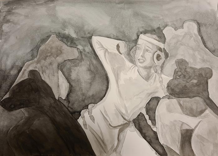 Anyway, it was fun to do this painting, even though I did leave this task for the last week.. 😉 I think I like the expression better in the ink sketch, more desperation and a bit sadness, but I did not dare to fiddle anymore with the watercolor version.