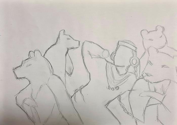 I made the final painting at home but now using watercolors instead. Sketches and painting: