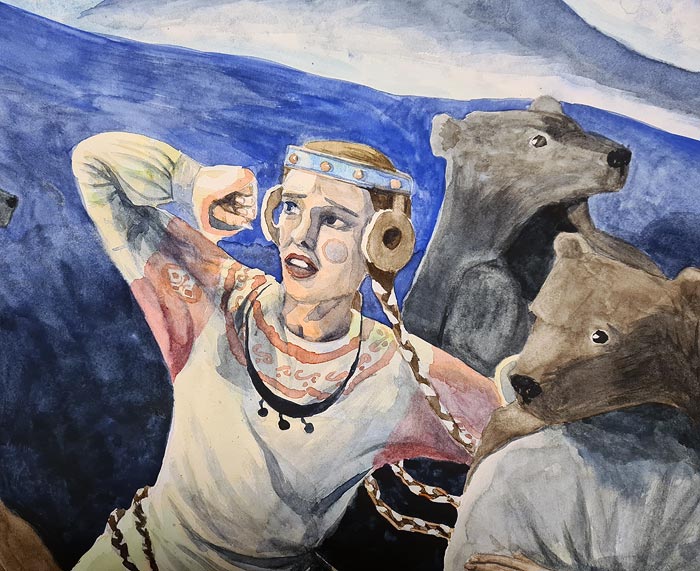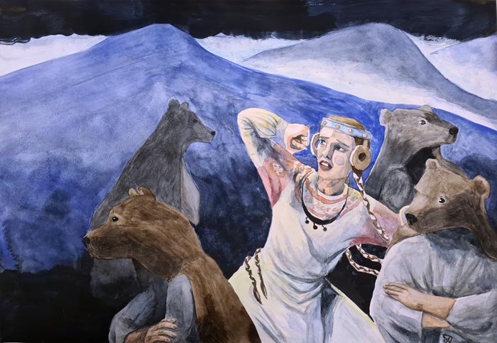 Instead the ballet performance inspired me and I chose a scene from the end of the dance where our sacrifice is about to dance herself to death, being quite scared in the middle of the bear people. The work was about movement but I wanted to pick this scene as it had so strong emotions, but it was otherwise quite still moment for a few seconds, so I had some movement then from the hair and accessories.