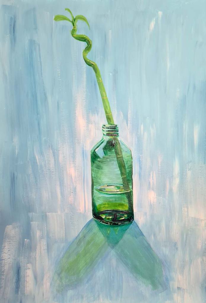 So, the survivor bamboo lives in a green old lemonade glass bottle but I decided not to paint any of the label content into the painting. Originally I was planning on having just the ‘AID+’ part visible (full text LEMONAID+) but I felt the water level was too low and I did not want the text on top of the painted water level, nor the bottom parts. So I will all this finished now with this simplified green bottle 🙂