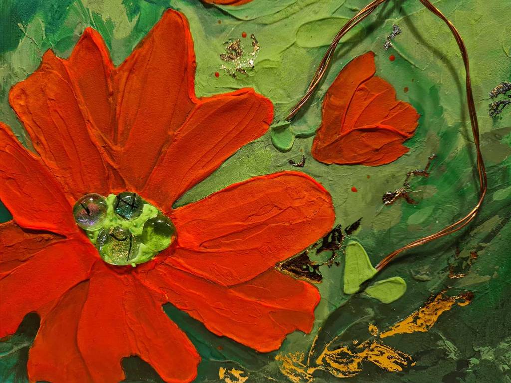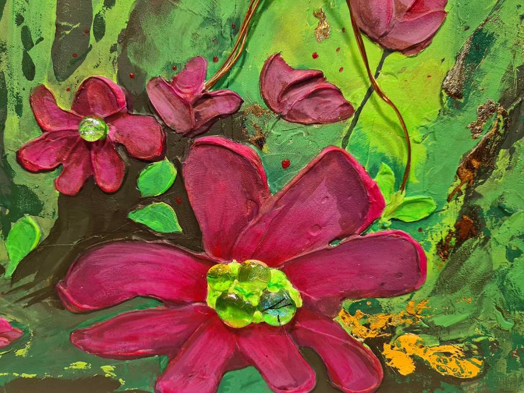 Then the last part, making the additional 3d flowers into the painting. The flowers were attached into the heads of the copper wires protruding from the top of the paintings.