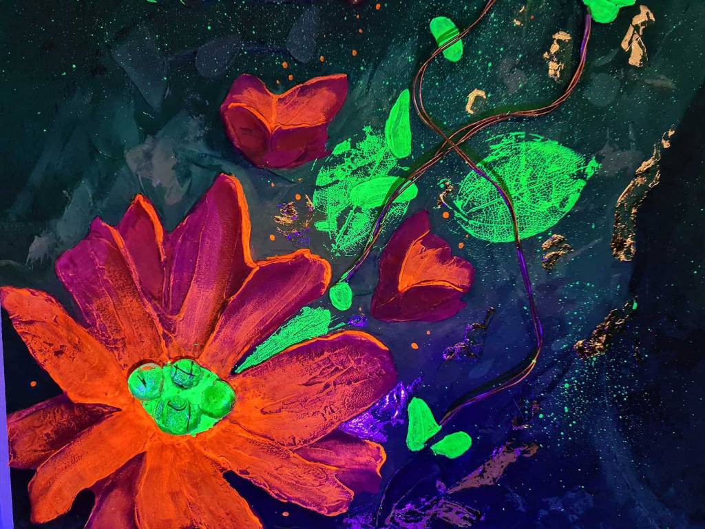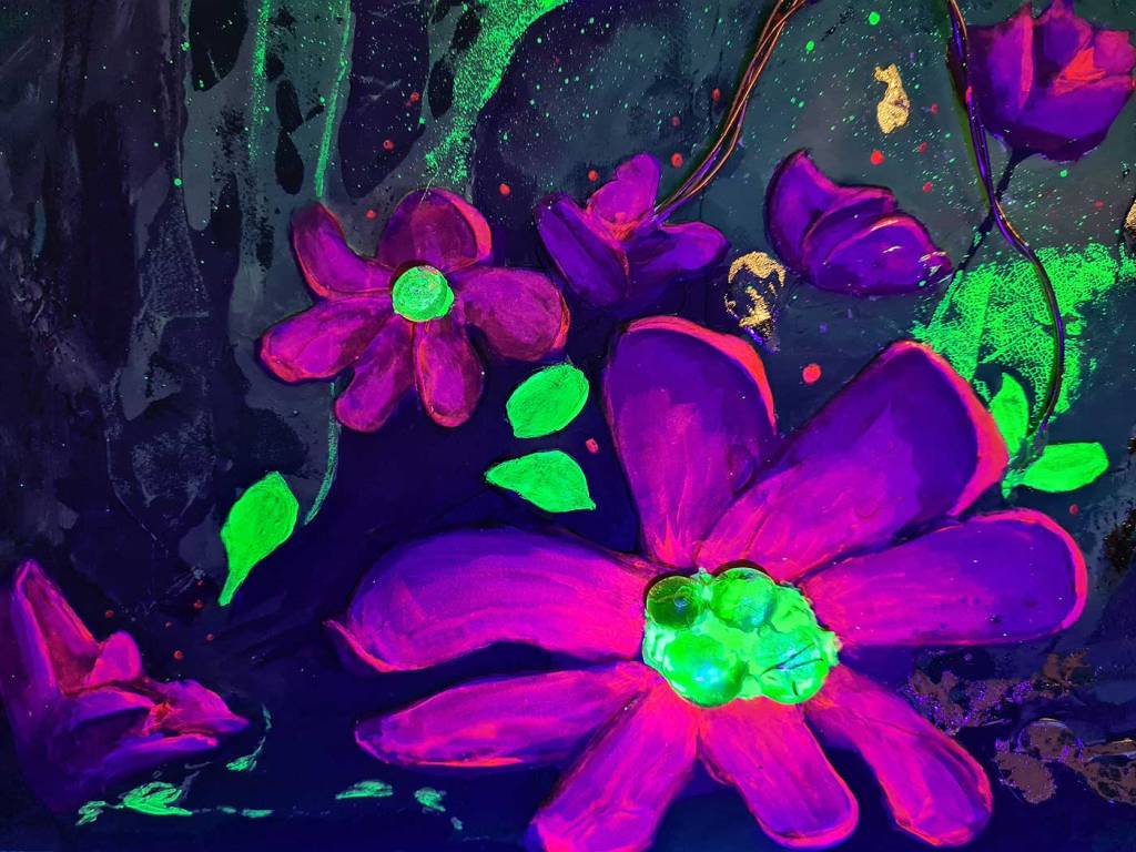 The main driver for these paintings was the coming exhibition, a dark room with UV lights in a paradise theme. So fluorescent acrylic painting was used in these paintings as well. The flower paintings cannot be seen in the museum in other than the UV lights on, so here you get to see what they look in normal light 🙂 I wanted the pieces to work in normal light as well, not requiring UV and then to have a hidden bonus.