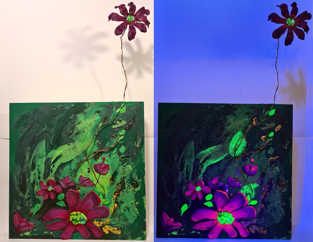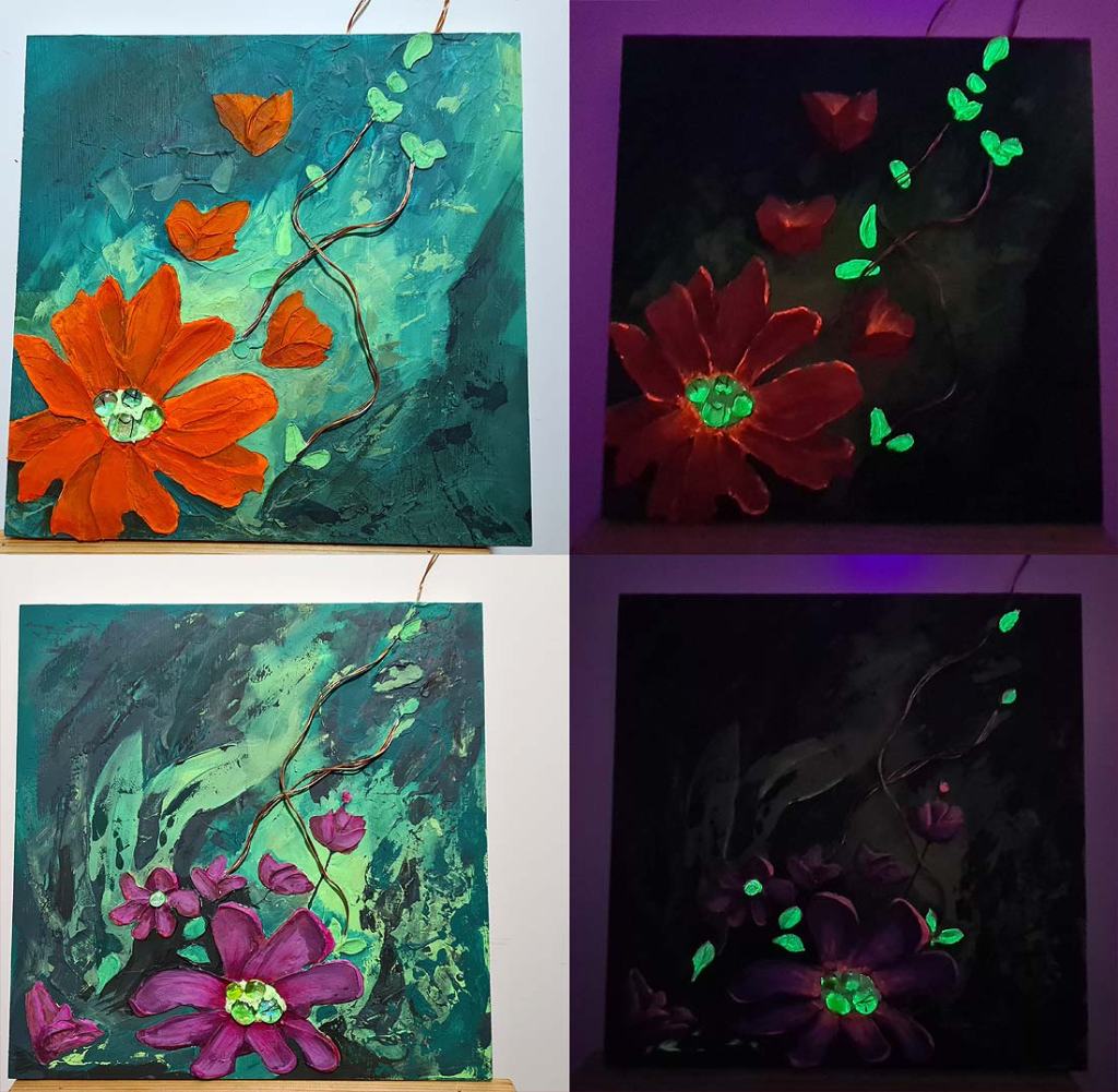 And then the finished paintings. Left in normal light and the right side in UV light: