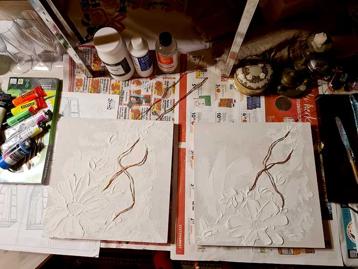 I started the panels with gesso and modeling paste. I spread the modeling paste here and there and formed flower petals with a palette knife. Then I drilled tiny whole in some places, attached copper wires to the canvases and finished the surface with gesso.