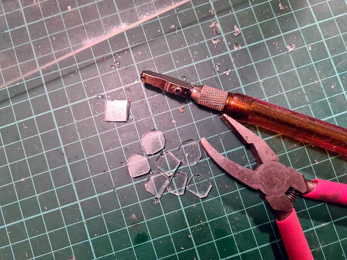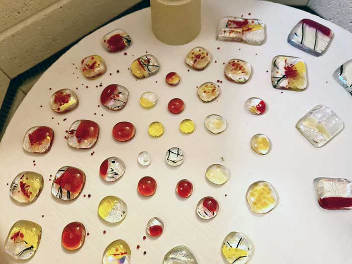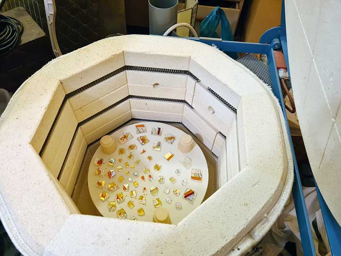 Then I went a head to make the glass parts from dichroic glass. I prepared the pieces for some melting time over the night, making tiny squares with different colors.