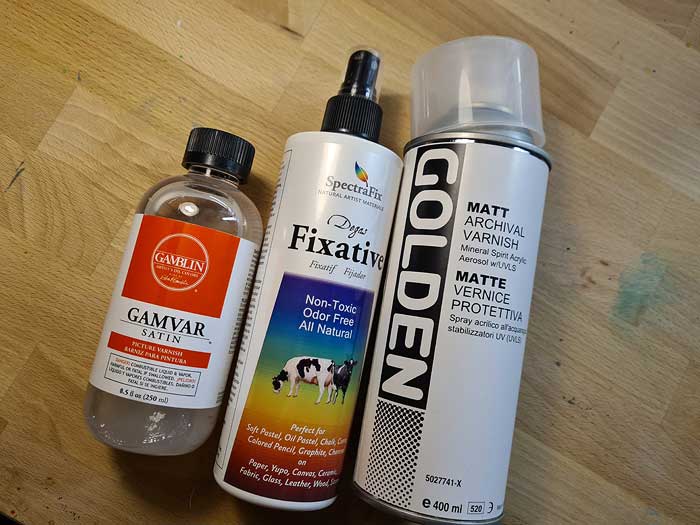 In the end I used the Gamblin Gamvar satin to varnish the painting itself and then the SpectraFix Degas fixative on the clay flowers.